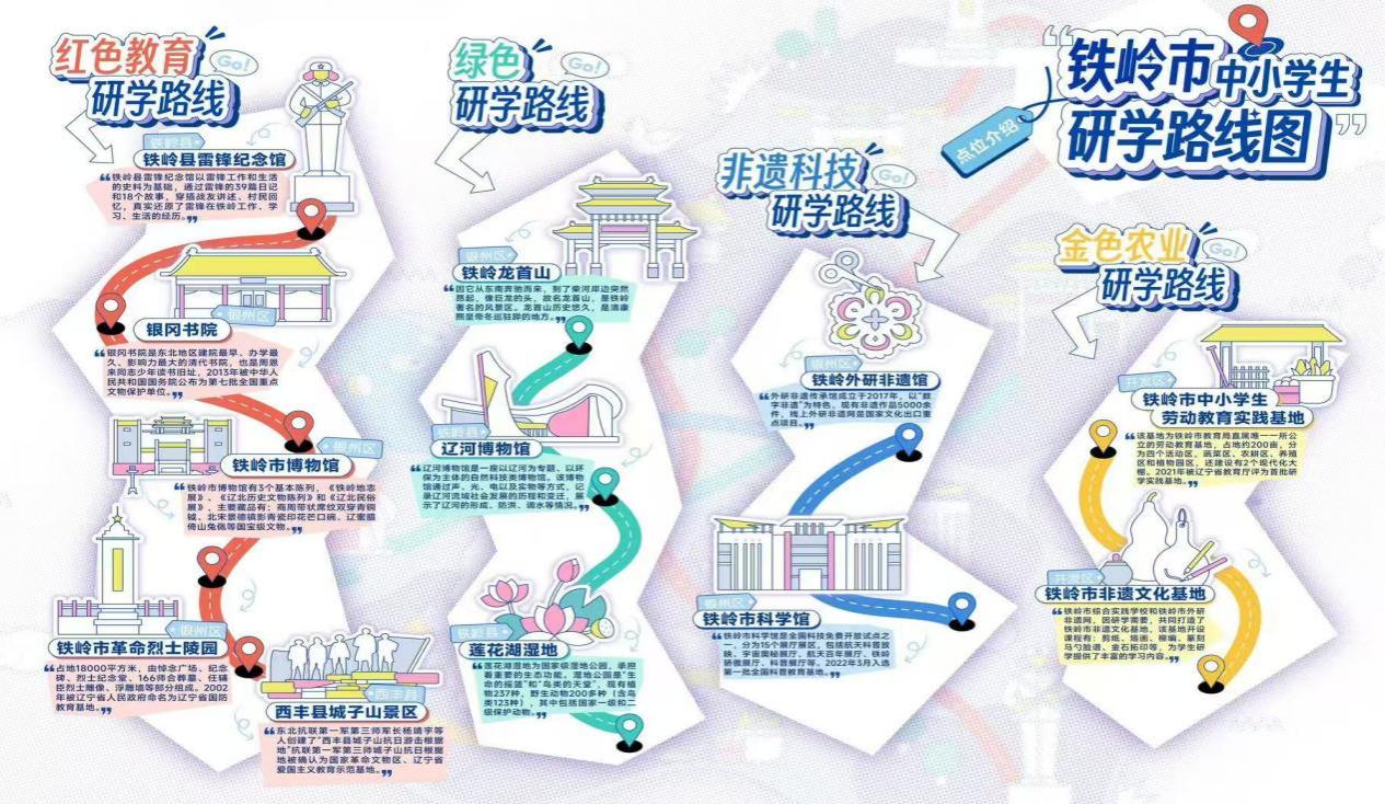 一是教育局联合文旅、综合实践学校等部门,依托市域内丰富的历史文化、地域文化、民俗文化资源,以及已评定的市级研学基地等优势,打造独具本土特色的研学线路;二是要积极推动跨区域开展研学活动,积极组织学生到辽宁省教育厅公布的首批免费开放研学实践活动场馆开展活动,实现研学资源共享,逐步形成跨区域互联互通互认的研学旅行网络。